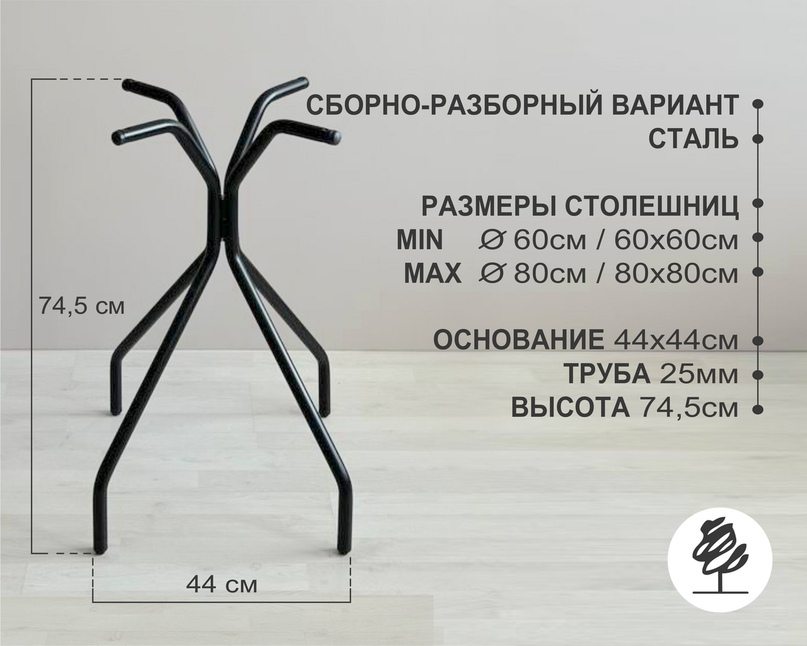- Габариты: основание: 44х44 см, высота 74 см, вес 3,8 кг, труба 25 мм.
